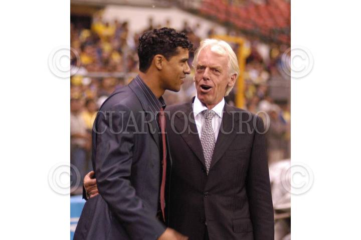 Los entrenadores holandeses Frank Rijkaard y Leo Beenahakker se saludan antes del comienzo del juego America vs Barcelena en la cancha del estadio Azteca. FOTO: German RomeroCUARTOSCURO.COM