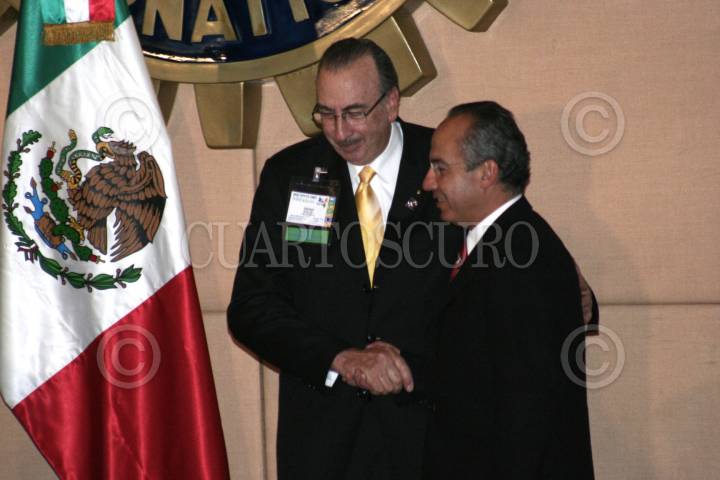 MÉXICO D.F. 23FENRERO2007.- El presidente Felipe Calderón Hinojosa asistió a la celebración del Club de Rotarios con motivo del 102 Aniversario y el cual recibio un reconocimiento de manos del Presidente Mundial de los Rotarios Sr. Wilf Wilkinson acompañado de a sesposa esposa Margarita Zavala, los acompaña Frank Devlin entre otros. FOTO: JERONIMO MORENO/CUARTOSCURO.COM