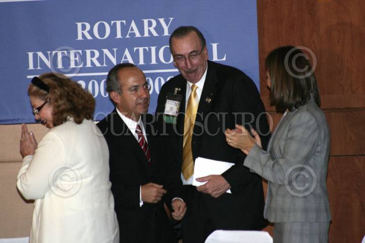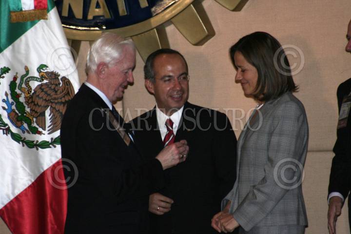 MÉXICO D.F. 23FENRERO2007.- El Presidente Felipe Calderón Hinojosa asistió al Club de Rotarios con Motivo del 102 Aniversario y el cual recibio un reconocimiento de manos del Presidente Mundial de los Rotarios Sr. Wilf Wilkinson acompañado de a sesposa Esposa Margarita Zavala, los acompaña Frank Devlin entre otros. FOTO: JERONIMO MORENO/CUARTOSCURO.COM