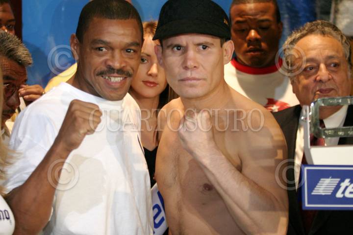 México, D.F., 21MAYO2004.- Julio César Chávez y Frankie Randall, muestran sus guardias durante la ceremonia de pesaje. El campeón mexicano pone con esta pelea fin a su carrera pugilística. La pelea se realizará en la Plaza de México este sabado. FOTO: Moisés Pablo/CUARTOSCURO.COM