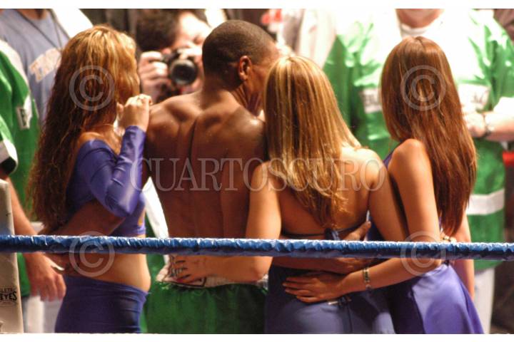 MEXDF23MAYO2003.- Frankie Randall aunque no gano la pélea de despedida de Julio Cesar Chavez, al final del combate recibio como precio un recuerdo de las edecanes. FOTO: Germán Romero/CUARTOSCURO.COM