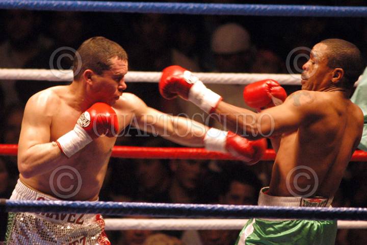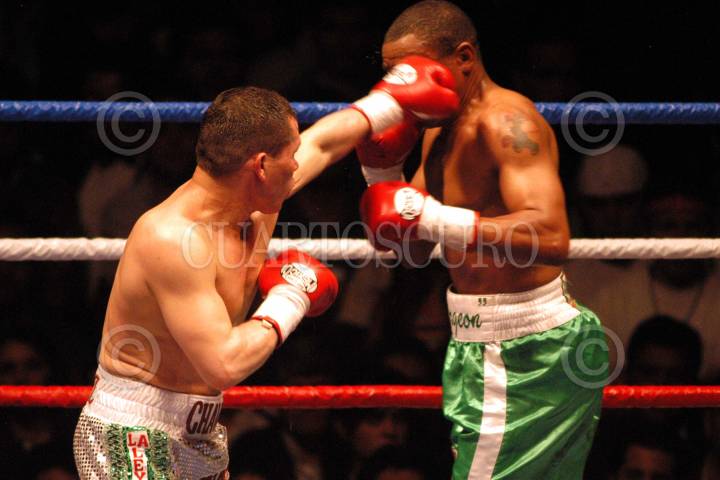 MEXDF14ABRIL2004.- El estadounidense Frankie Randall, recibe un golpe del mexicano Julio César Chávez, durante el anuncio de la pelea de box ¨La Ultima Revancha¨, que se realizara el 22 de mayo en la plaza de toros México. FOTO: Germán Romero/CUARTOSCURO.COM