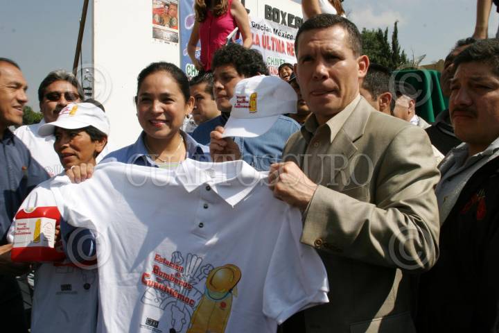 México, D. F. 15 Mayo 2004.- El boxeador Julio César Chávez y la delegada en Cuauhtemoc Virgina Jaramillo pidieron apoyo para la colecta para construir la estación de bomberos en esa demarcación. FOTO: Nelly Salas/CUARTOSCURO.COM