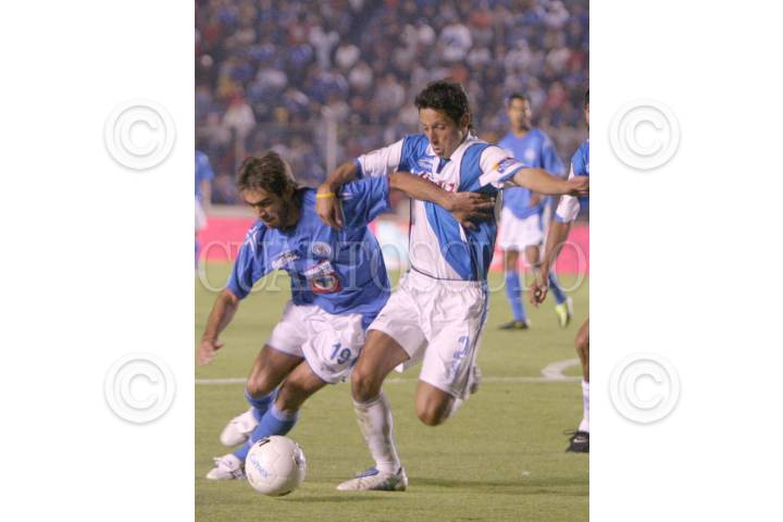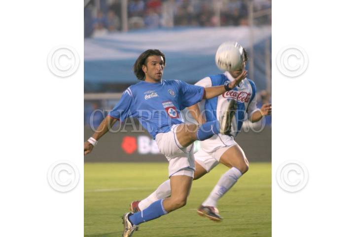 MEXICO D.F 15 ENERO 2005.- El jugador del Cruz Azul Cesar " Chelito" Delgado disputa la pelota con Ignacio Hierro del Puebla en la Jornada uno del Torneo de Clausura 2005 en donde La Màquina Celeste del cruz Azul gano 3-1. FOTO: Eunice Adorno/CUARTOSCURO.COM
