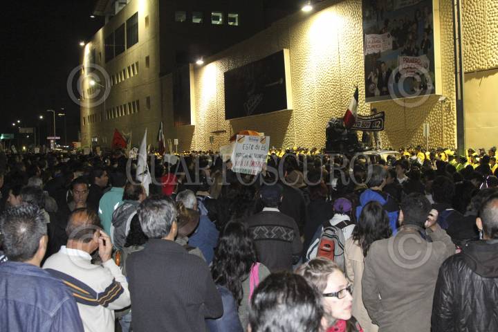MÉXICO D.F., 26JULIO2012.- Integrantes del movimiento "Yo Soy 132", SME y organizaciones sociales, se manifestaron frente a las instalaciones de Televisa Chapultepec, donde realizaron una toma simbólica de la televisora. Personal de la SSP-DF resguardaron las instalaciones para evitar agresiones a los edificios de Televisa. FOTO: SAÚL LÓPEZ /CUARTOSCURO.COM