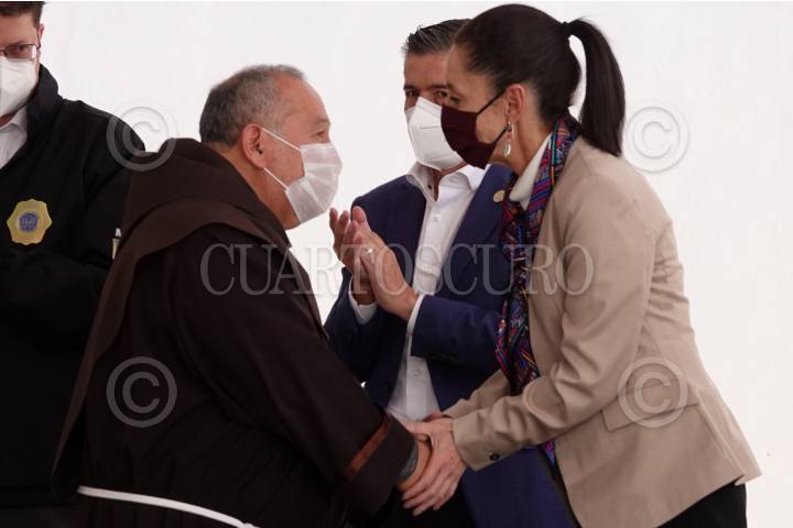 Fray Vidal Enríquez Barrientos, y Claudia Sheinbaum, jefa de Gobierno, se saludaron durante el programa "Si al desarme, si a la Paz", realizado en la Capilla de San Apóstol y Evangelista