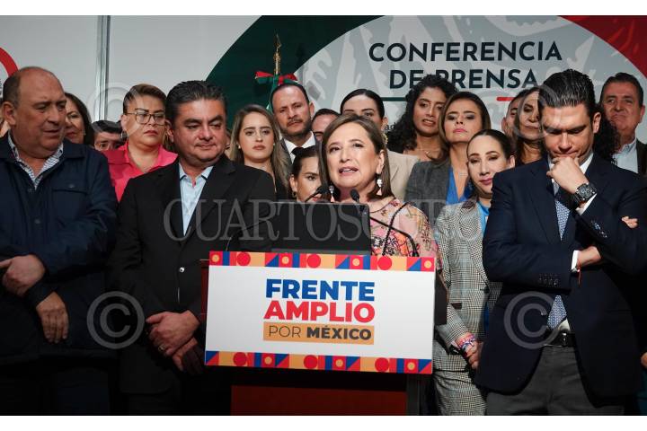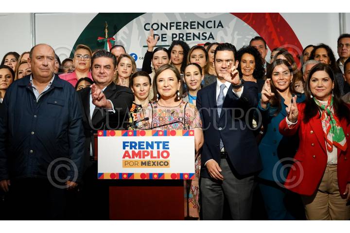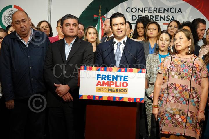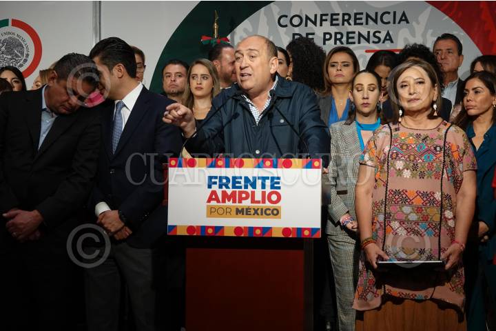 CIUDAD DE MÉXICO, 31OCTUBRE2023.- Los coordinadores Rubén Moreira (PRI), Luis Espinoza Cházaro (PRD) y Jorge Romero (PAN), junto con Xóchitl Gálvez, senadora y coordinadora del Frente Amplio, ofrecieron una conferencia de prensa en la Cámara de Diputados. FOTO: GRACIELA LÓPEZ /CUARTOSCURO.COM