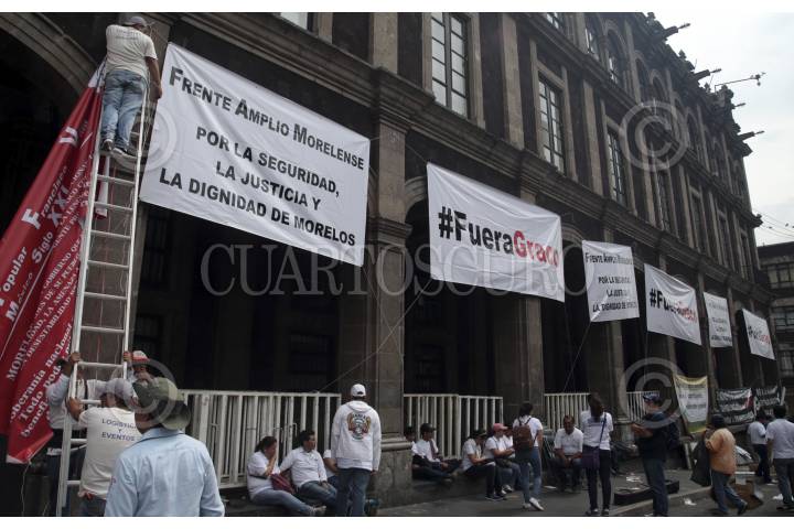 CUERNAVACA, MORELOS, 16AGOSTO2016.- Como parte de las acciones que implementa el Frente Amplio Morelense en contra del gobernador de Morelos, Graco Ramírez Abreu, transportistas bloquearon con sus unidades las principales vías de la capital. La Universidad Autónoma del Estado de Morelos tomo simbólicamente el palacio de gobierno y lo cubrió con mantas e instalo carpas en derredor con el fin de bloquear las actividades que ahí se realizan. El bloqueo se mantendrá de manera indefinida hasta que el gobierno federal intervenga. FOTO: MARGARITO PÉREZ RETANA /CUARTOSCURO.COM