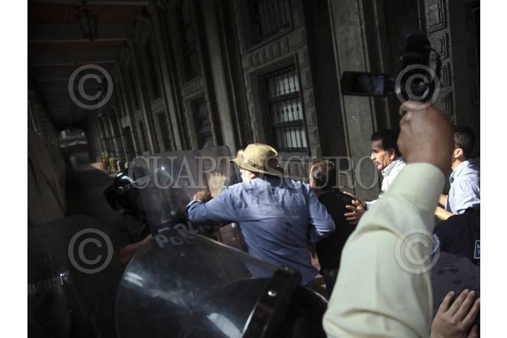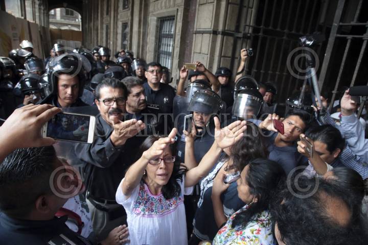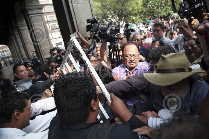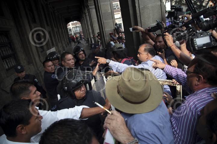 CUERNAVACA, MORELOS, 29AGOSTO2016.- El activista Javier Sicilia resultó lesionado en un zafarrancho con policías del Mando Único que resguardaban el Palacio de Gobierno de Morelos. Luego de que en la madrugada los activistas que mantenían tomado el pasillo del inmueble fueron desalojados por la fuerza pública, el poeta encabezó la nueva toma, acompañado de unas 30 personas del Frente Amplio Morelense, que retiraron las vallas que pusieron los policías y los empujaron hasta lograr entrar. Más tarde, 50 policías obligaron a los manifestantes a salir del recinto. El ambiente se encuentra tenso. FOTO: MARGARITO PÉREZ RETANA /CUARTOSCURO.COM