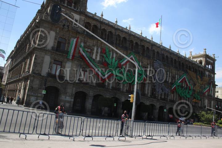 Decenas de integrantes del Frente Nacional de Anti-AMLO intentaron tomar por completo la plancha del zócalo, autoridades capitalinas solo les dejaron instalarse del asta bandera hacia el edificio del Congreso local, la otra mitad, la del asta bandera hacia el Palacio Nacional, estaba resguardada por policías capitalinos. FOTO: MOISÉS PABLO/CUARTOSCURO.COM
