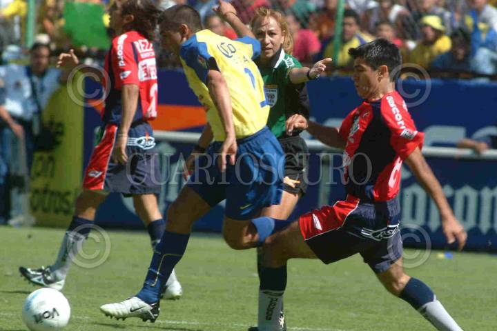 Irapuato, 22FEBRERO2004.- Virginia Tovar es la primera mujer que pita un partido como arbitro central de un partido de primera división del fútbol mexicano. Debutando en el encuentro entre los Freseros del Irapuato y Aguilas del América. FOTO: Gerardo Garcia/CUARTOSCURO.COM