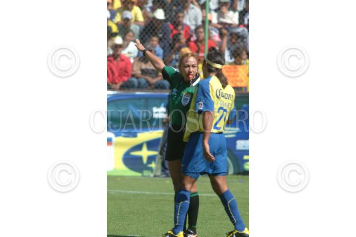Irapuato, 22FEBRERO2004.- La arbitro central Virginia Tovar, muestra en el cartón rojo a Reinaldo Navia, jugador americanista. Los Freseros del Irapuato se impusieron 2-1 a las Aguilas del América, en partido disputado en el estadio Sergio León Chávez. FOTO: Iván Stephens/CUARTOSCURO.COM