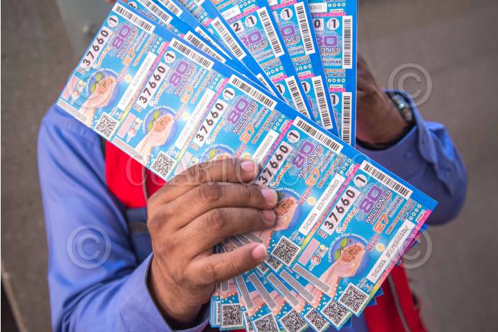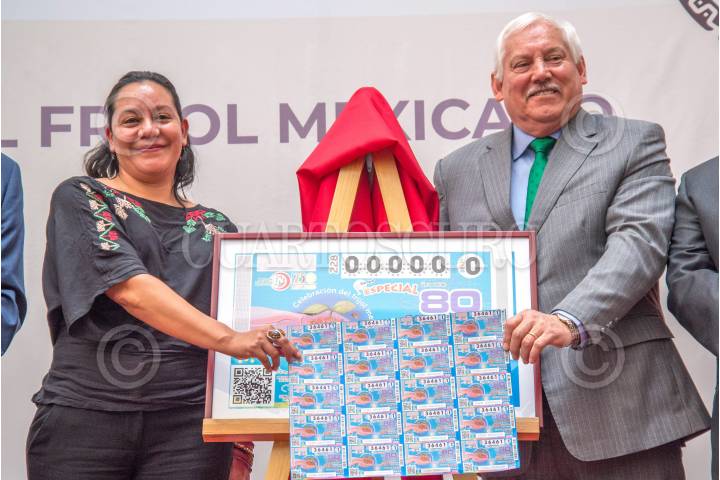 Víctor Villalobos y María Luisa Albores sostienen cachitos para el sorteo del avión presidencial
