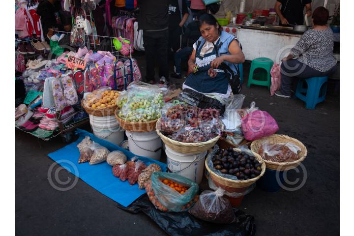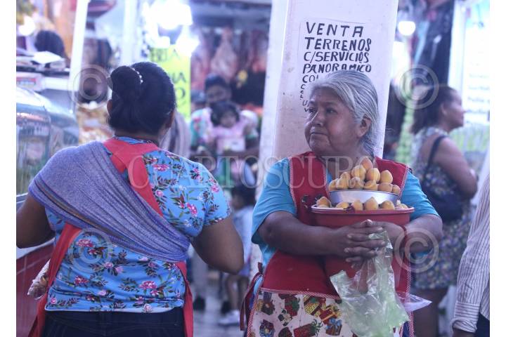 Un par de mujeres venden de manera ambulante frutas de temporada en el mercado Adolfo López Mateos.