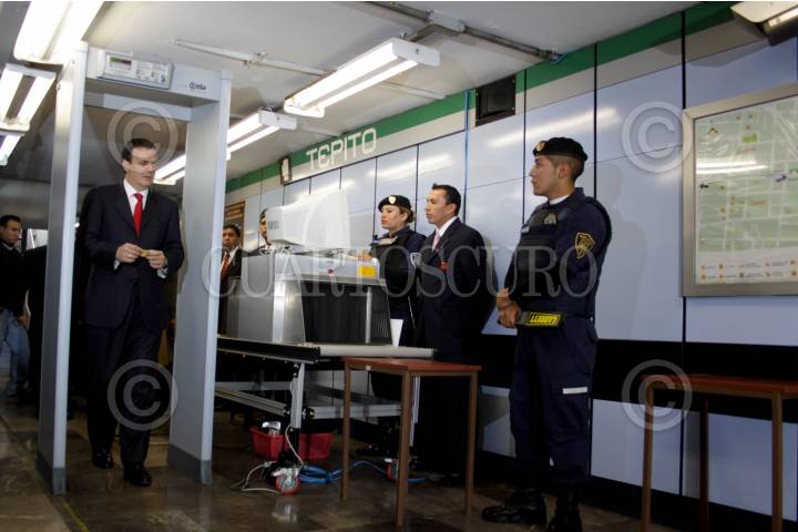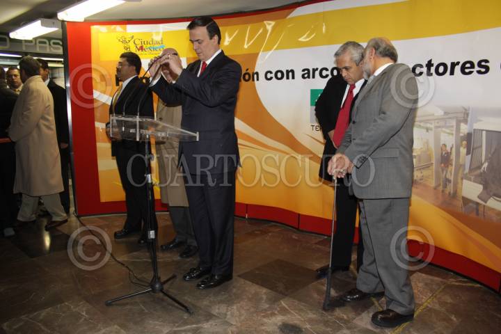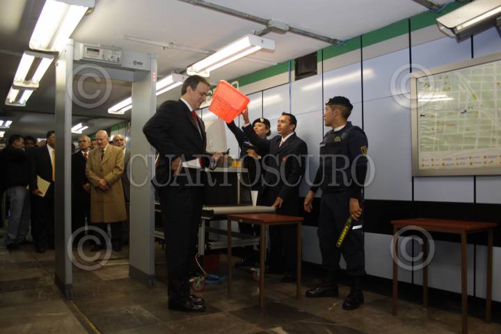 MÉXICO, D.F., 22DICIEMBRE2009.- Marcelo Ebrad, Jefe de Gobierno del Distrito Federal inaguró los arcos detectores de metal en la estacion del metro Tepito, que consiste en hacer una minusiosa revisión a los pasajeros con el fin de evitar el ingreso de usuarios con armas punzocortantes o de fuego. FOTO: SÁSHENKA GUTIÉRREZ/CUARTOSCURO.COM