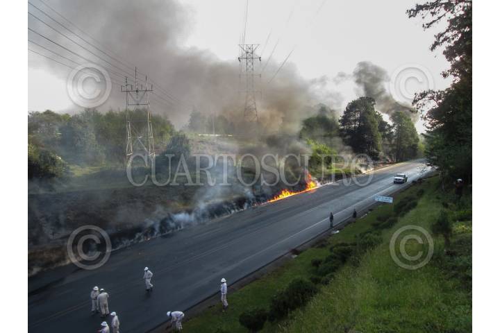 HUAUCHINANGO, PUEBLA, 20MARZO2015.-Personal de la Agencia de Seguridad, Energía y Ambiente (ASEA), en coordinación con la Profepa, cuantificará los daños ambientales y materiales del incendio y derrame de combustible registrados la mañana de este viernes en el oleoducto Poza Rica-Salamanca, a la altura de la localidad de Venta Chica, municipio de Huauchinango, Puebla, sobre la autopista México-Tuxpan. FOTO: SEMARNAT /CUARTOSCURO.COM