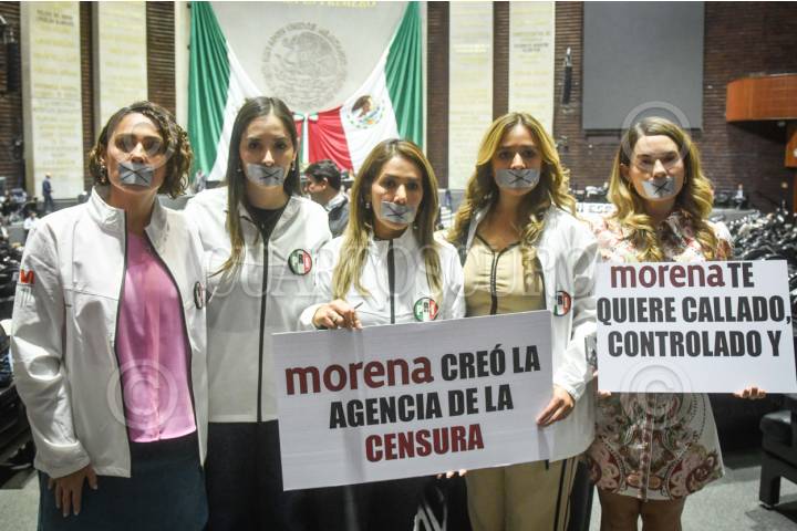 CIUDAD DE MÉXICO, 01JULIO2025.- Las diputadas priístas: Abigail Arredondo Ramos, Fuensanta Guadalupe Guerrero, Laura Ivonne Ruíz, Ariana del Rocío Rejón, durante su participación en tribuna, junto a sus compañeras de bancada, quienes se amordazaron para protestar en contra de la ley federal de Telecomunicaciones y Radiodifusión, la cual fue aprobada en lo general durante la sesión extraordinaria de la Cámara de Diputados. FOTO: MARIO JASSO/CUARTOSCURO.COM