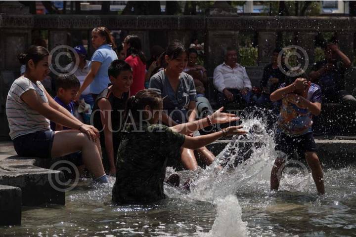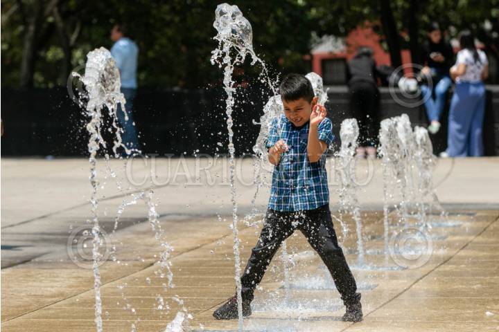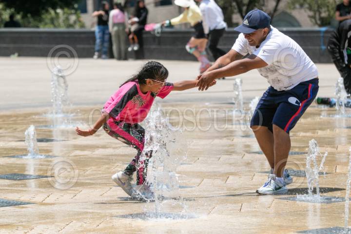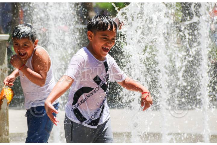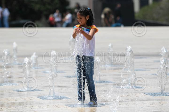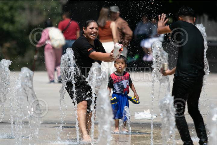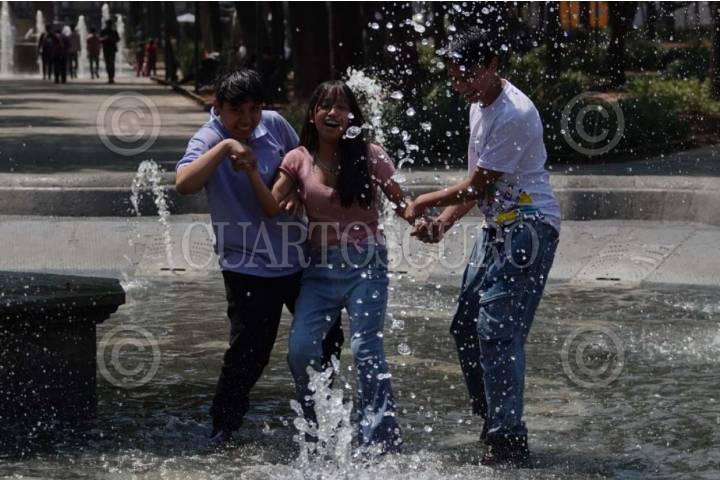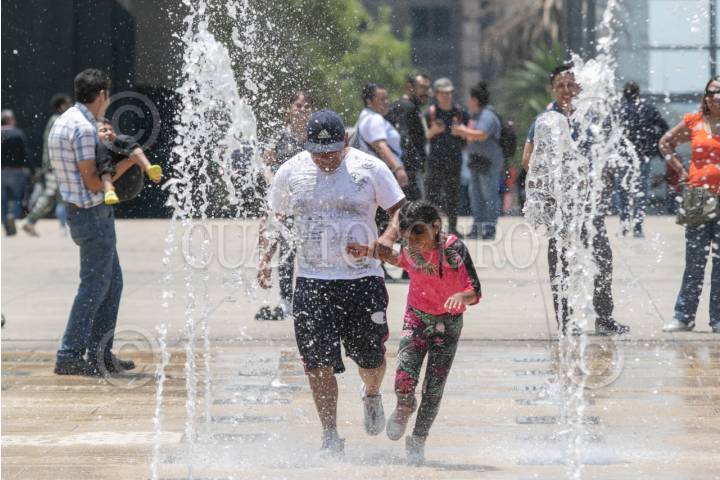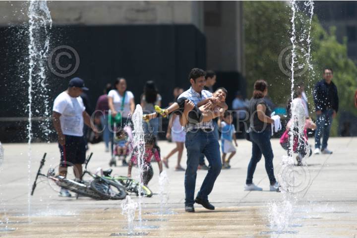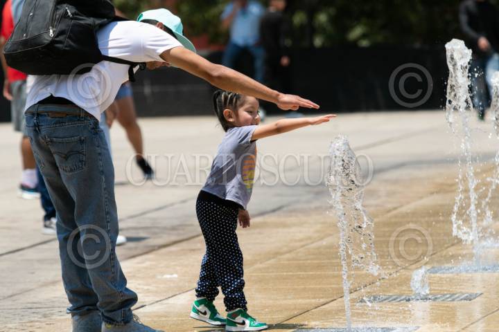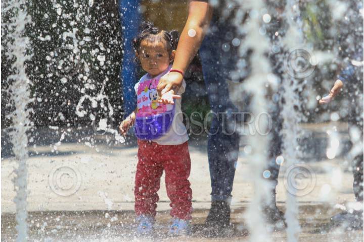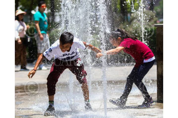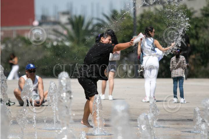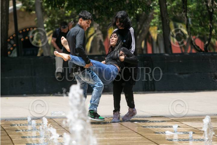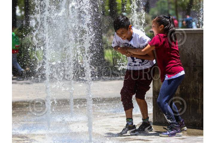 En la Alameda central, niños y jóvenes disfrutan de las fuente, y así mitigan el calor de este domingo soleado en el Centro de la capital Mexicana.