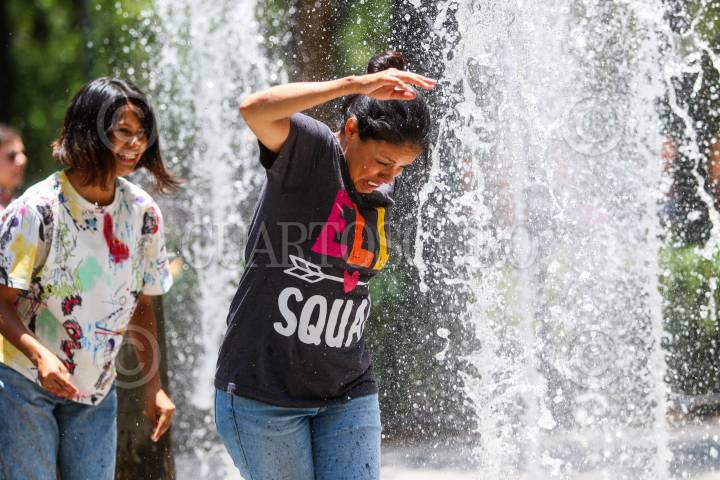 CIUDAD DE MÉXICO, 02ABRIL2024.- Jóvenes mitigan el calor en las fuentes de Alameda Central. Esta tarde se encuentra activa la Alerta Naranja y Alerta Amarilla por temperaturas altas en la capital. FOTO: GRACIELA LÓPEZ /CUARTOSCURO.COM