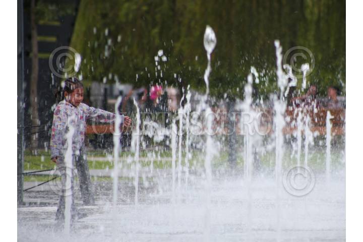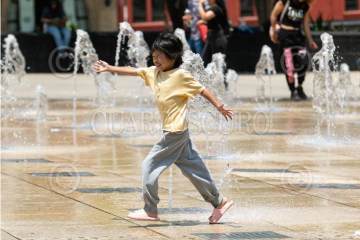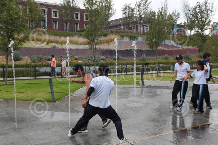 TOLUCA, ESTADO DE MÉXICO, 16MAYO2024.- Niños y jóvenes aprovechan las fuentes del Parque de la Ciencia Fundadores en Toluca para refrescarse un poco de las altas temperaturas que se registran en la capital mexiquense. FOTO: CRISANTA ESPINOSA AGUILAR /CUARTOSCURO.COM