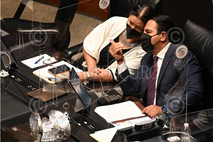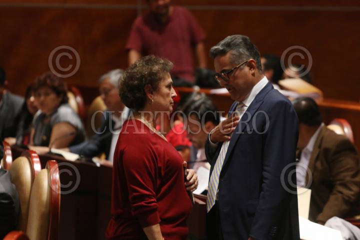 Dulce María Sauri y Eduardo Ramírez, presidentes de las mesas directivas de la Cámara de Diputados y Senadores, dialogan durante la sesión permanente.