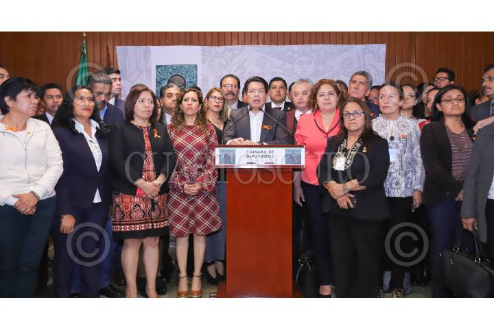 CIUDAD DE MÉXICO, 27NOVIEMBRE2018.- Legisladores de la coalición Juntos Haremos Historia, encabezados por los coordinadores de Morena, Mario Delgado; del PT, Reginaldo Sandoval; del PES, Fernando Manzanilla, ofrecieron conferencia de prensa para expresar una posición respecto al dictamen en materia de eliminación del fuero. FOTO: CUARTOSCURO.COM
