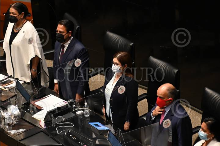 Dulce María Sauri, presidenta de la Mesa Directiva de la Cámara de Diputados y Eduardo Ramírez, presidente de la Mesa Directiva del Senado, encabezan el inicio de la sesión permanente en el Senado.