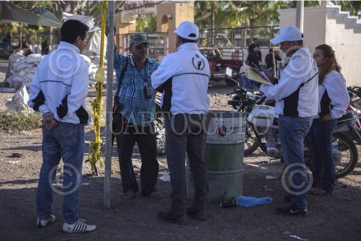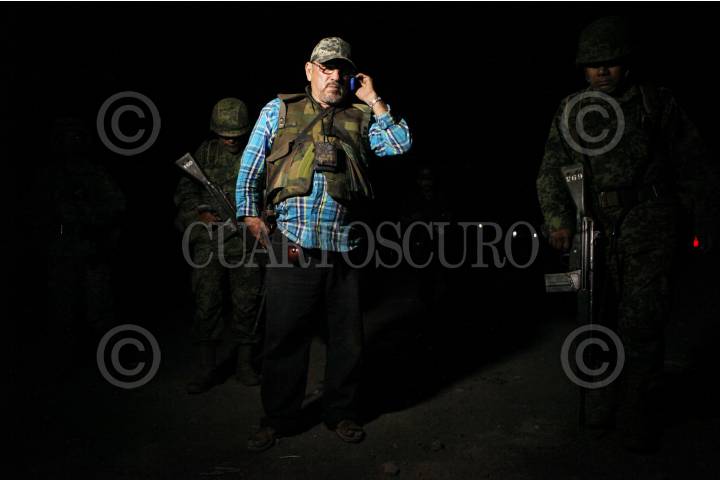 LA RUANA, BUENAVISTA, MICHOACÁN, 17DICIEMBRE2014.- Hipólito Mora, comandante de la Fuerza Rural de La Ruana, se encuentra declarando bajo custodia en la barricada ubicada a la entrada a la tenencia. Ayer por la noche su grupo sostuvo un encuentro a balazos con el grupo de El Americano en donde murieron once personas entre ellos su hijo Manuel Mora. FOTO: ALAN ORTEGA /CUARTOSCURO.COM