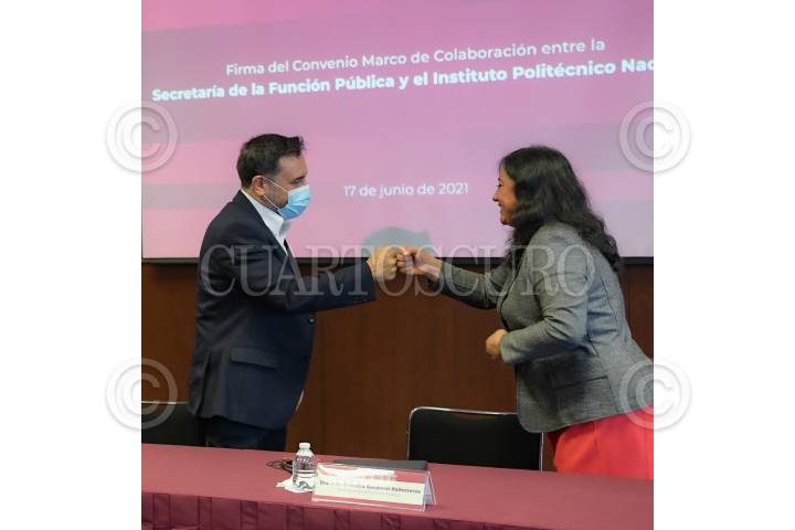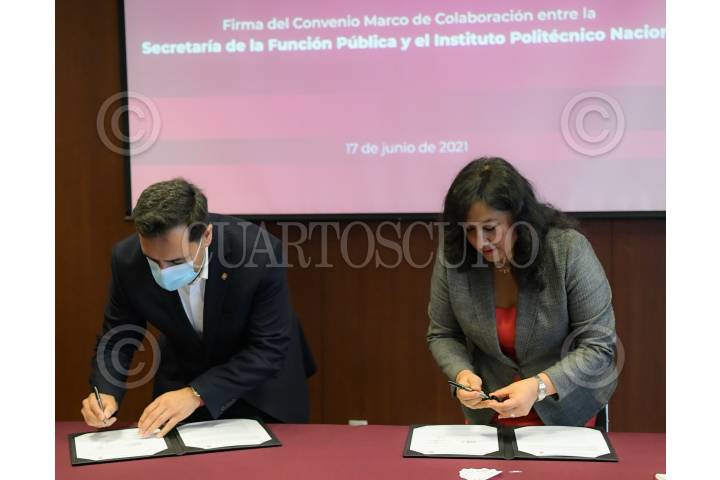 Eréndira Sandoval Ballesteros, secretaria de la función pública firmó con Arturo Reyes Sandoval, director general del Instituto Politécnico Nacional (IPN), un convenio de colaboración entre ambas instituciones para la realización de proyectos de profesionalización del servicio público, que permitan captar, retener y desarrollar el talento de las personas servidoras públicas.