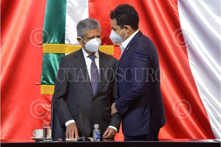Juan Carlos Romero Hicks, presidente de la comisión de Transparencia y Anticorrupción, platica con Roberto Salcedo Aquino, secretario de la Función Pública.