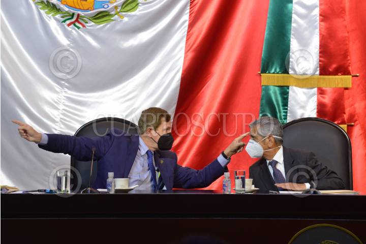 Pablo Guillermo Ángulo Briceño, presidente de la comisión de Vigilancia de la Auditoría Superior de la Federación, y Transparencia y Anticorrupción, saluda a Roberto Salcedo Aquino, secretario de la Función Pública.