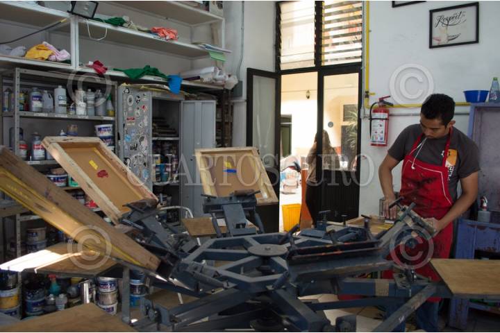 CIUDAD DE MÉXICO, 27MAYO2017.- Con la finalidad de apoyar a adolescentes en conflicto con la ley y jóvenes en situación de riesgo, ayudarlos a desarrollar habilidades y competencias, Fundación Reintegra y restaurantes Toks equiparon un taller de serigrafía en la colonia Guerrero. Cuatro años después, cientos de jóvenes han sido beneficiados y han logrado poner su propio negocio o emplearse en la industria formal. Las historias de dichos jóvenes están reunidas en el libro "Imprimiendo sueños", de Gustavo Pérez Berlanga. FOTO: SELENE PACHECO/ CUARTOSCURO.COM