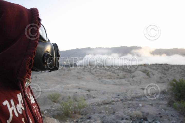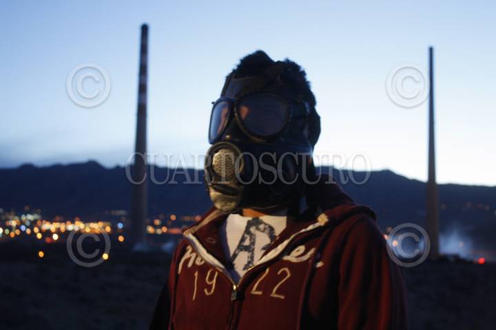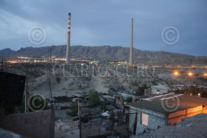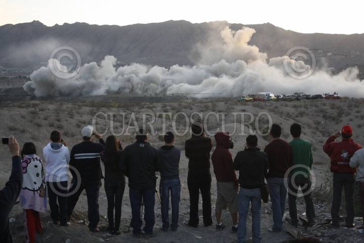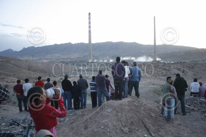 CIUDAD JUÁREZ, CHIHUAHUA, 13ABRIL2013.- La empresa estadounidense American Smelting and Refining Company (Asarco), demolió hoy sus emblemáticas chimeneas. Fue a las 06:51 cuando habitantes de la franja fronteriza de Cd. Juárez, escucharon las primeras detonaciones que llevarían el derrumbe de la primera torre de la fundidora; acontecimiento que fue presenciado por decenas de juarenses que madrugaron para no perderse el espectáculo. Asarco por años fue acusada de contaminar el aire y el suelo con plomo, en ambos lados de la frontera, que según reportes periodísticos cobró la vida de decenas de niños y jóvenes. FOTO: NACHO RUIZ /CUARTOSCURO.COM