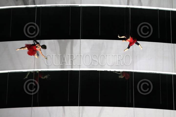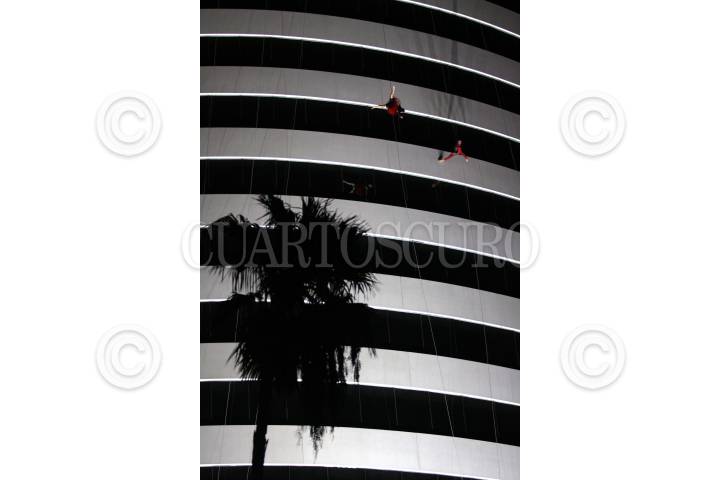 MONTERREY, NUEVO LEÓN, 29SEPTIEMBRE2013.- Los bailarines estadounidenses Bandaloop ofrecieron un espectáculo en donde ejecutaron danza contemporánea a una altura de más de 100 metros en la torre administrativa, a un costado del Parque Fundidora dentro de las actividades del festival internacional Santa Lucía 2013. FOTO: GABRIELA PÉREZ MONTIEL / CUARTOSCURO.COM