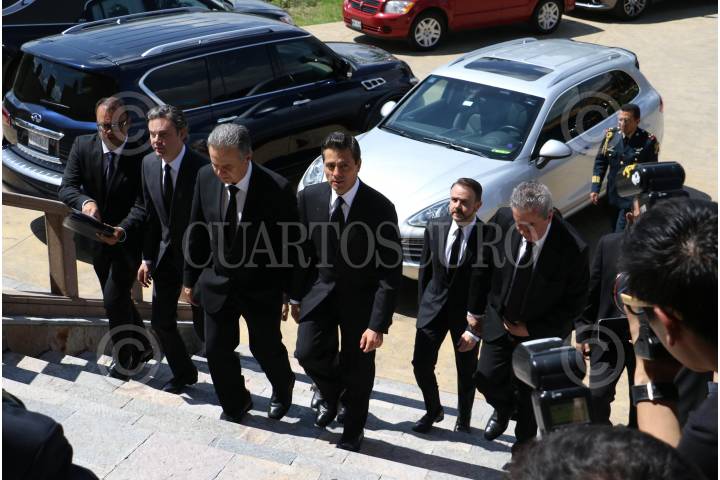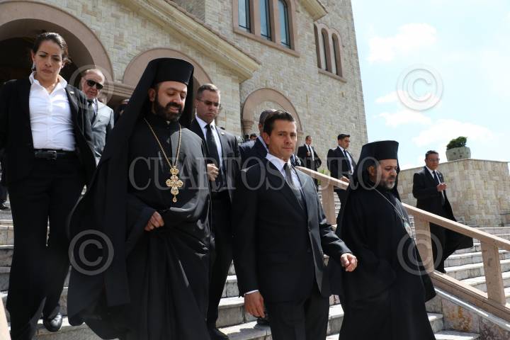 HUIXQUILUCAN, ESTADO DE MÉXICO, 15JUNIO2017.- Enrique Peña Nieto, presidente de Mexico acompañado de Aurelio Nuño, titular de la SEP y Pedro Joaquín Codwell, titular de la SENER fueron recibidos por Fadi Rabbat, archimandrita de la iglesia ortodoxa, en el funeral de Antonio Chedraoui, Arzobispo Metropolitano de la Iglesia Ortodoxa de Antioquía, para México, Venezuela, Centroamérica y el Caribe. FOTO: SAÚL LÓPEZ /CUARTOSCURO.COM