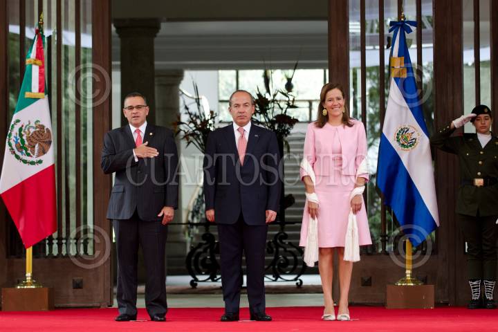MÉXICO, D.F., 20JUNIO2011.- Felipe Calderón Hinojosa, presidente de México acompañado de su esposa y primera dama Margarita Zavala, durante la recepción a Mauricio Funes (izquierda), presidente de El Salvador que se realizó en la residencia oficial de Los Pinos. FOTO: MISAEL VALTIERRA/CUARTOSCURO.COM
