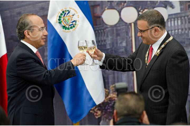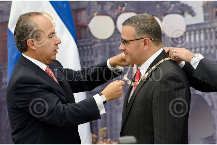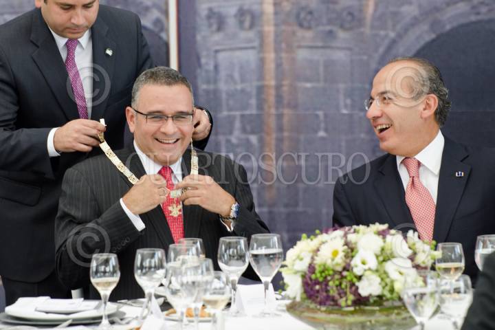 MÉXICO, D.F., 20JUNIO2011.- Felipe Calderón Hinojosa, presidente de México, entregó la condecoración de la "Orden Mexicana del Águila Azteca", en grado de collar, a Mauricio Funes, presidente de El Salvador durante un almuerzo de estado en honor al mandatario salvadoreño quien realiza una visita de estado a México. Ésto se realizó en el Alcazar del Castillo de Chapultepec. FOTO: MISAEL VALTIERRA/CUARTOSCURO.COM