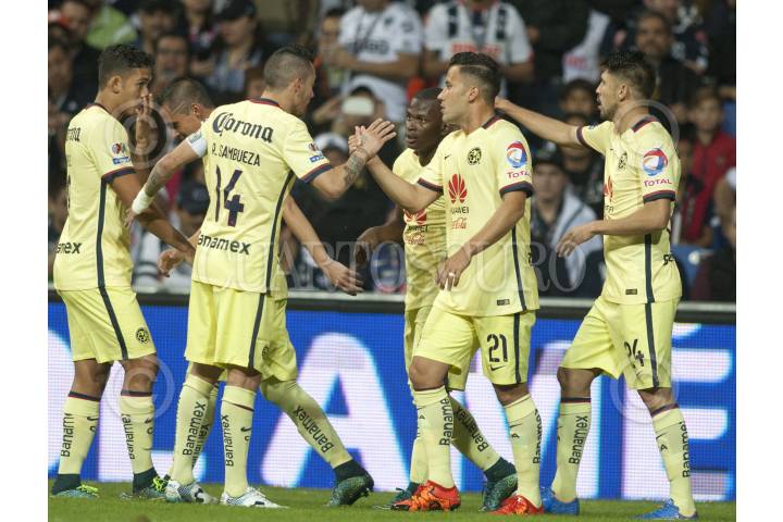 MONTERREY, NUEVO LEÓN, 07NOVIEMBRE2015.- Jugadores del equipo de las Águilas del América, festejan el gol durante el primer tiempo ante el equipo de los Rayados del Monterrey, en el estadio BBVA Bancomer, partido correspondiente a la jornada 16 de la Liga MX, Apertura 2015. Marcador Final: Monterrey 2 - América 1. FOTO: GABRIELA PÉREZ MONTIEL / CUARTOSCURO.COM