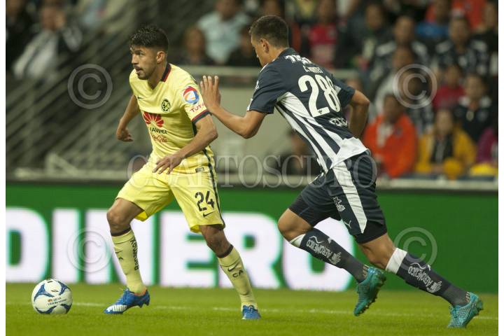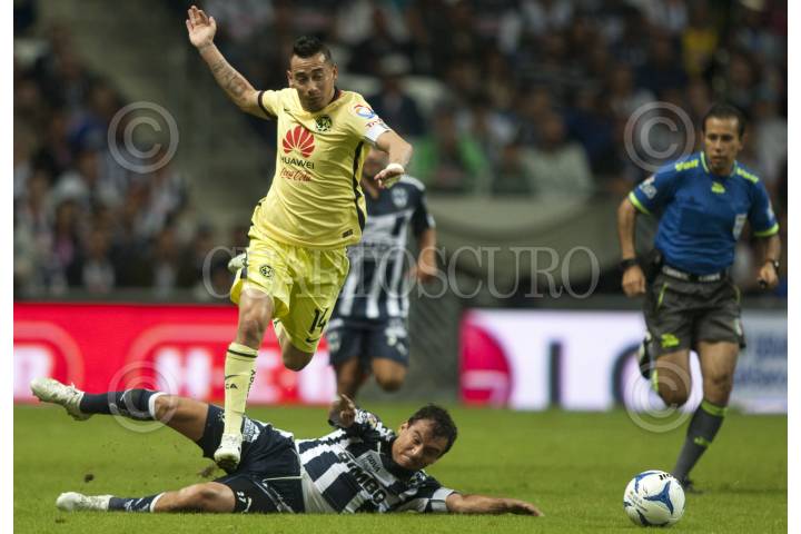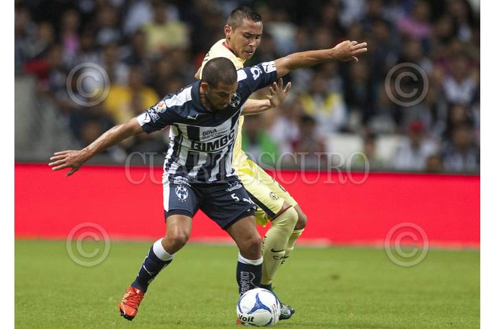 MONTERREY, NUEVO LEÓN, 07NOVIEMBRE2015.- Walter Gargano del equipo de los Rayados del Monterrey se disputa el balón con Paúl Aguilar del equipo de las Águilas del América, en el estadio BBVA Bancomer, partido correspondiente a la jornada 16 de la Liga MX, Apertura 2015. Marcador Final: Monterrey 2 - América 1. FOTO: GABRIELA PÉREZ MONTIEL / CUARTOSCURO.COM