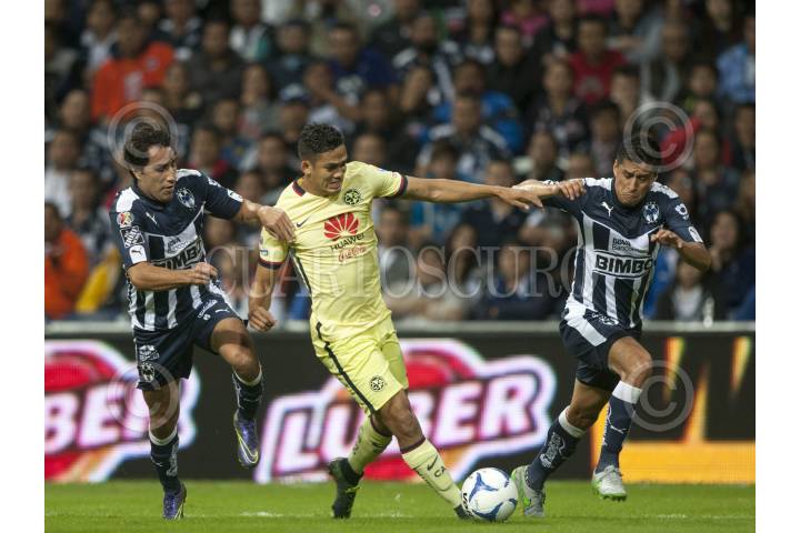 MONTERREY, NUEVO LEÓN, 07NOVIEMBRE2015.- Efraín Juárez y Ricardo Osorio del equipo de los Rayados del Monterrey se disputa el balón con Andrés Andrade del equipo de las Águilas del América, en el estadio BBVA Bancomer, partido correspondiente a la jornada 16 de la Liga MX, Apertura 2015. Marcador Final: Monterrey 2- América 1. FOTO: GABRIELA PÉREZ MONTIEL / CUARTOSCURO.COM