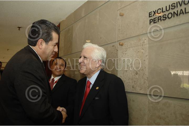 MÉXICO, D.F., 30NOVIEMBRE2009.- El Ministro Gerardo Gongora Pimentel al término de la sesión solemne que se efectuo esta mañana con motivo de la conclusión de su mandato, se despide de Carlos Navarrete Ruiz Presidente de la Mesa Directiva del Senado de la República. FOTO: CUARTOSCURO.COM