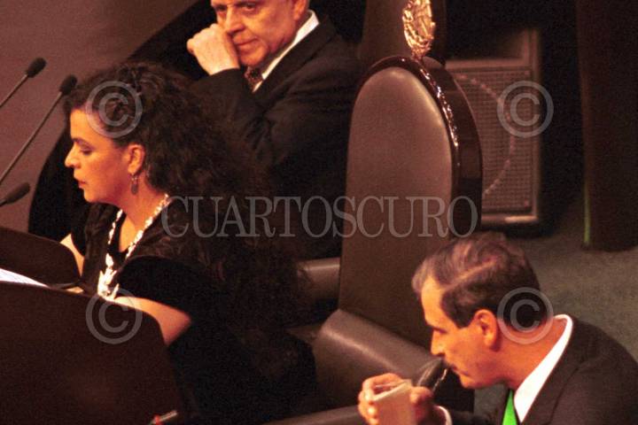 Genaro Gongora Pimentel, presidente de la SCJN, escucha con atención a la diputada Beatriz Paredes, durante el Informe de Gobierno del presidente Fox. FOTO:Victoria Valtierra/CUARTOSCURO.COM
