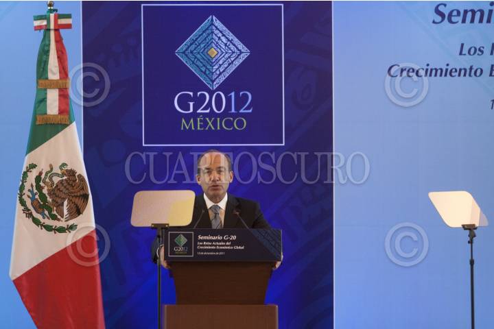 MÉXICO, D.F., 13DICIEMBRE2011.- Felipe Calderón Hinojosa, Presidente de México, encabezó la clausura del seminario del G-20 "Desafíos Actuales para el Crecimiento Económico Global", la cual se celebró en las instalaciones de la Secretaría de Relaciones Exteriores. FOTO: MOISÉS PABLO/CUARTOSCURO.COM