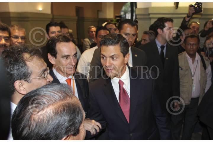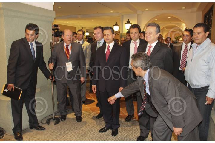 MÉXICO, D.F., 04MAYO2012.- Enrique Peña Nieto, candidato de la coalición "Compromiso por México" acompañado de su equipo de campaña entre ellos Luis Videgaray y David López Gutierrez a su salida de la reunión con integrantes del Consejo Siglo XXI, previo a lo que será el G20. FOTO: SAÚL LÓPEZ/CUARTOSCURO.COM