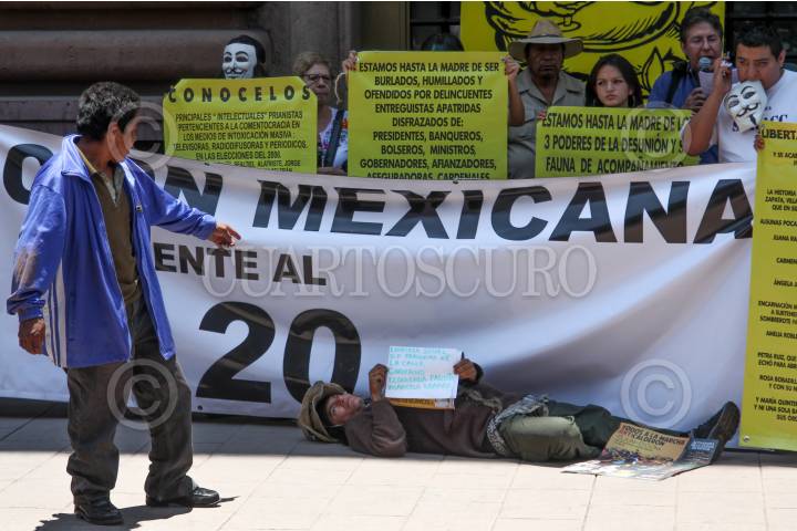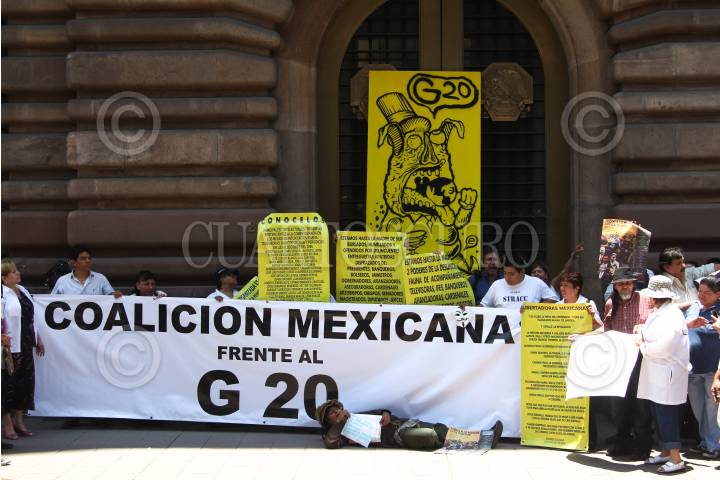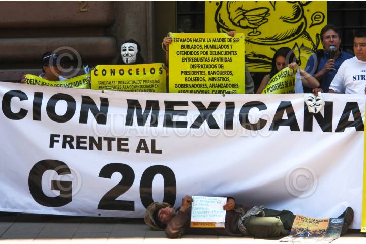 MÉXICO, D.F., 14JUNIO2012.- Un grupo de personas se manifestó y clausuro simbolicamente el edificio del Banco de México en protesta por la cumbre del G20 que se realizara en Los Cabos. FOTO: ENRIQUE ORDÓÑEZ /CUARTOSCURO.COM