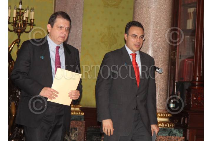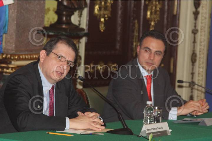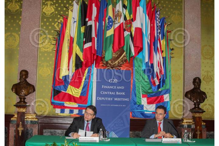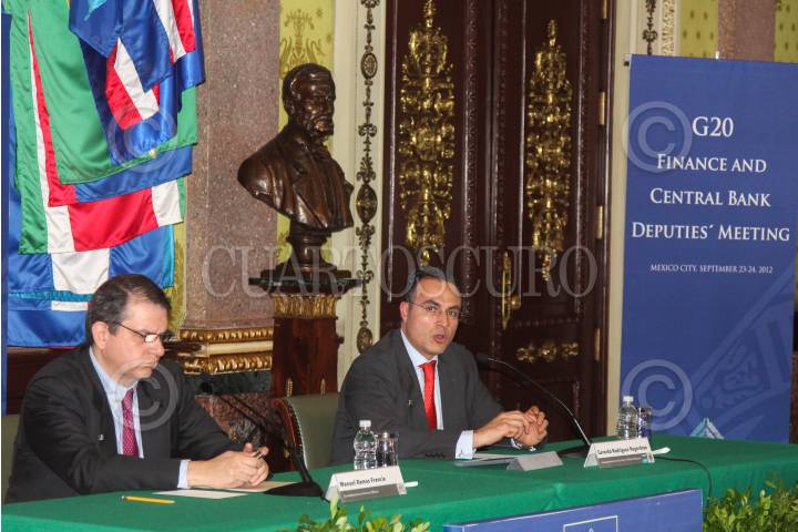 MÉXICO, D.F. 24SEPTIEMBRE2012.- Manuel Ramos Francia, Subgobernador del Banco de México y Gerardo Rodríguez Regordosa, Subsecretario de Hacienda, en conferencia de prensa anunciaron que la economía mundial enfrenta importantes riesgos a la baja, así mismo anunciaron que los viceministros de finanzas y bancos centrales del G-20 ven un impacto positivo en los mercados por las medidas tomadas por los bancos centrales de Estados Unidos y Europa. FOTO: SAÚL LÓPEZ /CUARTOSCURO.COM