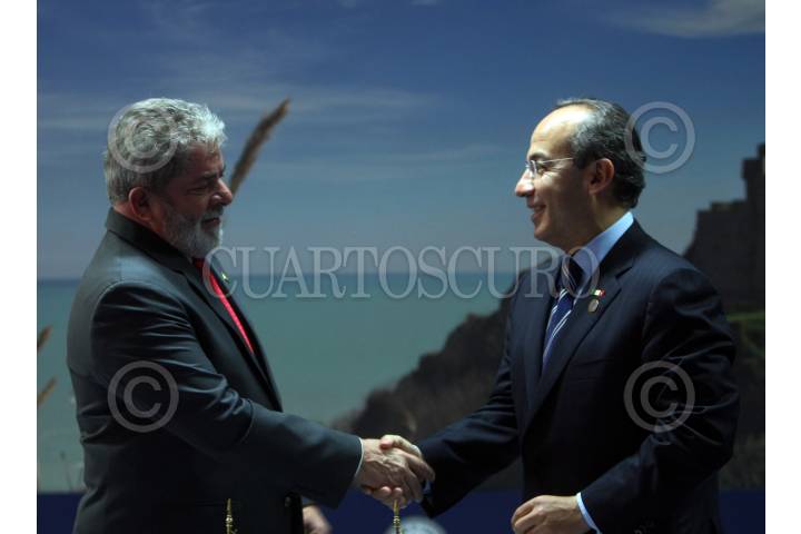 L´AQUILA, LOS ABRUZOS, ITALIA, 08JULIO2009.- Felipe Calderón Hinojosa, presidente de México, durante una reunión que sostuvo con Luiz Inácio Lula Da Silva, presidente de Brasil, esto en el marco de la reunión bilateral del G-5 y que tuvo lugar en la escuela de Suboficiales de la Guardia de Finanzas. FOTO: ALFREDO GUERRERO/CUARTOSCURO.COM