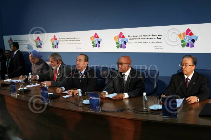 L´AQUILA, LOS ABRUZOS, ITALIA, 08JULIO2009.- Manmohan Singh, primer Ministro de la India, Luiz Inácio Lula Da Silva, presidente de Brasil, Felipe Calderón Hinojosa, presidente de México, Jacob Zuma, presidente de la República de Sudafrica y Wen Jiabao, primer Ministro de China, durante la reunión del G-5 y que tuvo lugar en la escuela de Suboficiales de la Guardia de Finanzas. FOTO: ALFREDO GUERRERO/CUARTOSCURO.COM