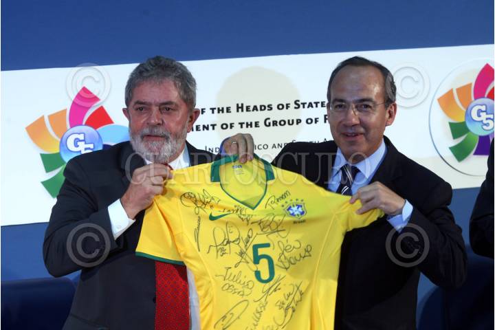 L´AQUILA, LOS ABRUZOS, ITALIA, 08JULIO2009.- Manmohan Singh, primer Ministro de la India, Luiz Inácio Lula Da Silva, presidente de Brasil, Felipe Calderón Hinojosa, presidente de México, Jacob Zuma, presidente de la República de Sudafrica y Wen Jiabao, primer Ministro de China, durante la foto oficial dentro del marco de la reunión del G-5 y que tuvo lugar en la escuela de Suboficiales de la Guardia de Finanzas. FOTO: ALFREDO GUERRERO/CUARTOSCURO.COM