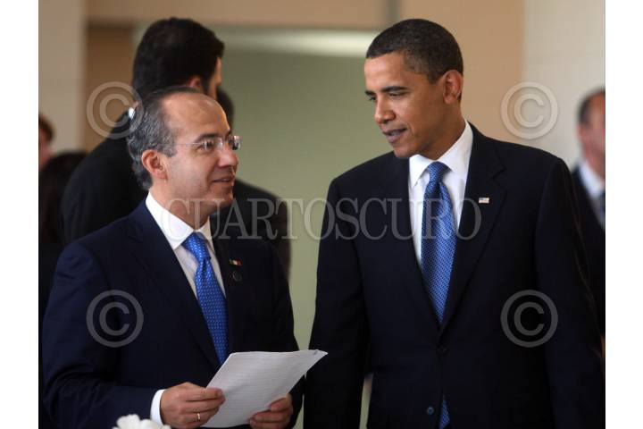 L´AQUILA, LOS ABRUZOS, ITALIA, 09JULIO2009.- Felipe Calderón Hinojosa, presidente de México, dialoga con Barack Obama, presidente de los Estados Unidos, durante el congreso del grupo del G-8 y G-5, que tuvo lugar en la escuela de Suboficiales de la Guardia de Finanzas. FOTO: ALFREDO GUERRERO/CUARTOSCURO.COM
